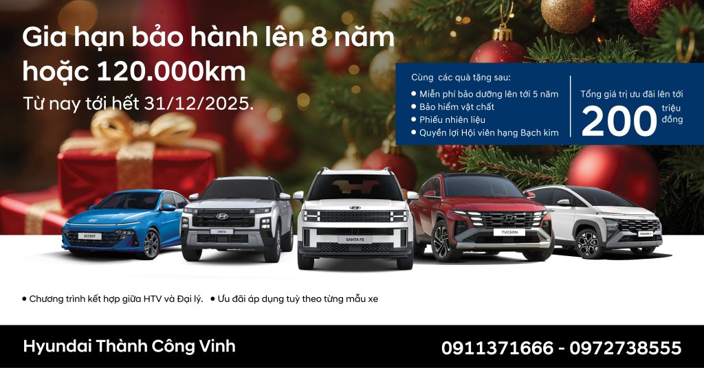 Bước vào tháng 12, Hyundai Thành Công Vinh mang đến loạt ưu đãi đặc biệt như một lời tri ân sâu sắc dành cho Quý khách hàng. Chúng tôi không chỉ trao giá trị bằng những con số ưu đãi, mà còn lan toả sự an tâm thông qua chất lượng xe tiêu chuẩn quốc tế, công nghệ tiện nghi và sự bền bỉ đã được khẳng định của Hyundai – để mỗi chuyến đi của Quý khách luôn trọn vẹn và đáng tin cậy.